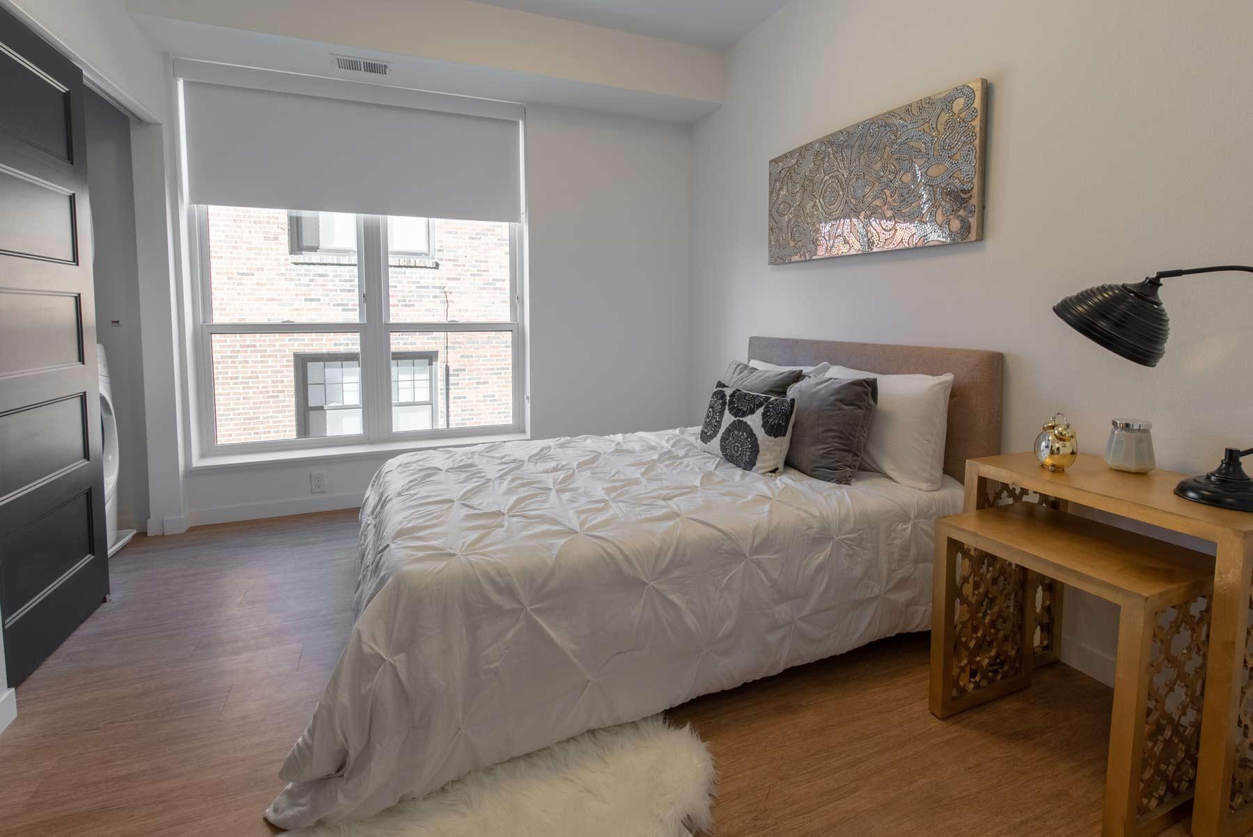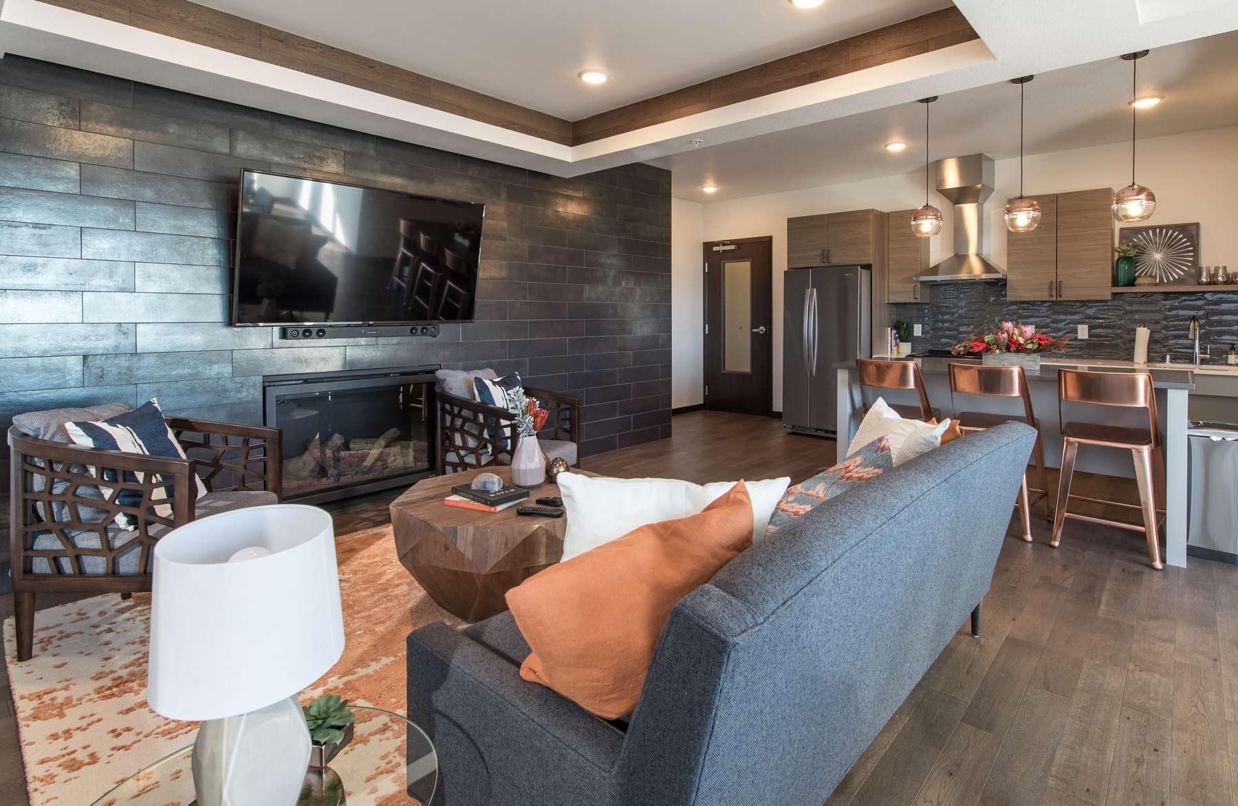 The apartment building features luxury finishes, community rooftop spaces, heated parking, and outdoor decks. The apartment home options include one and two-bedroom apartments, one-bedroom townhomes, and one-bedroom plus den options.