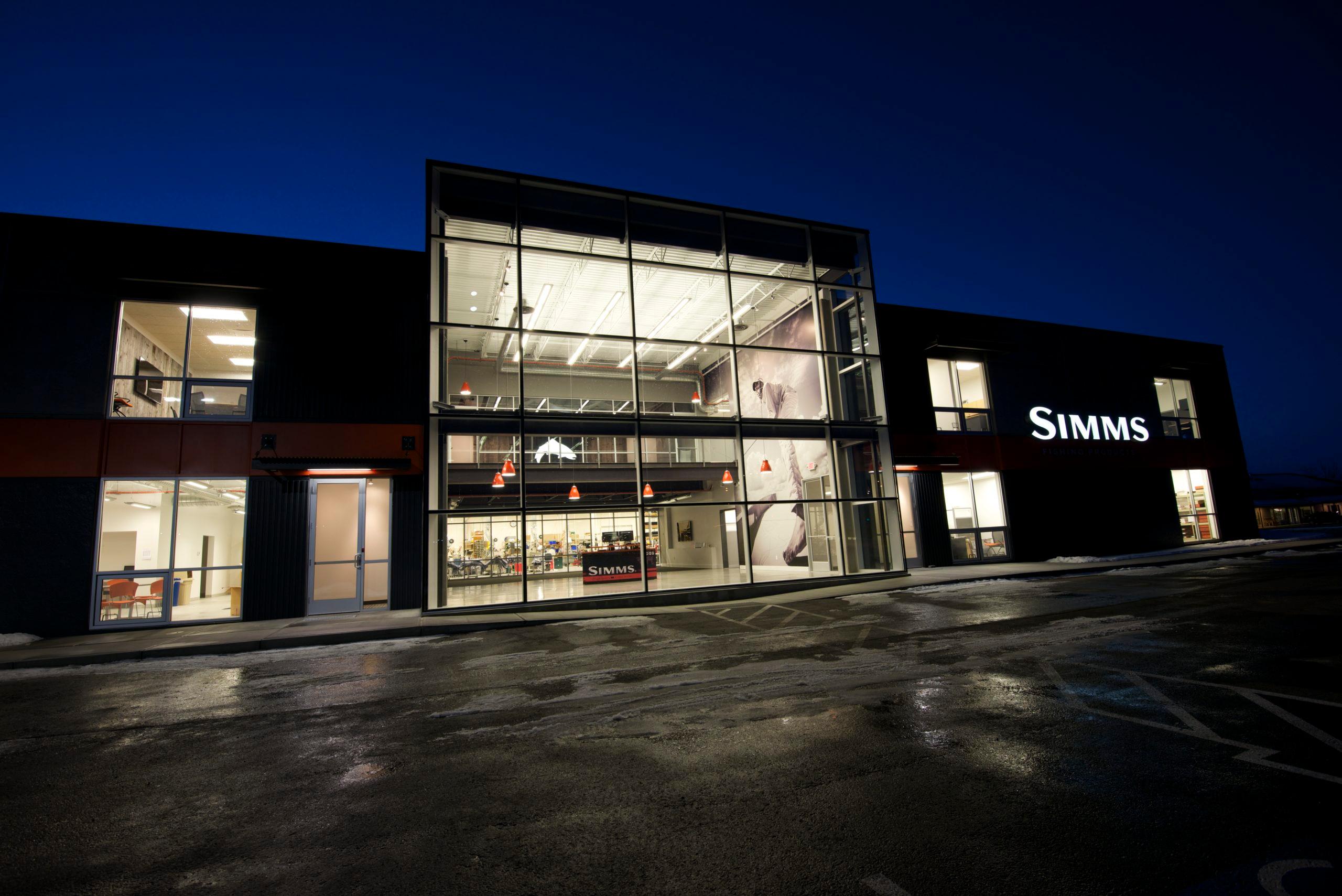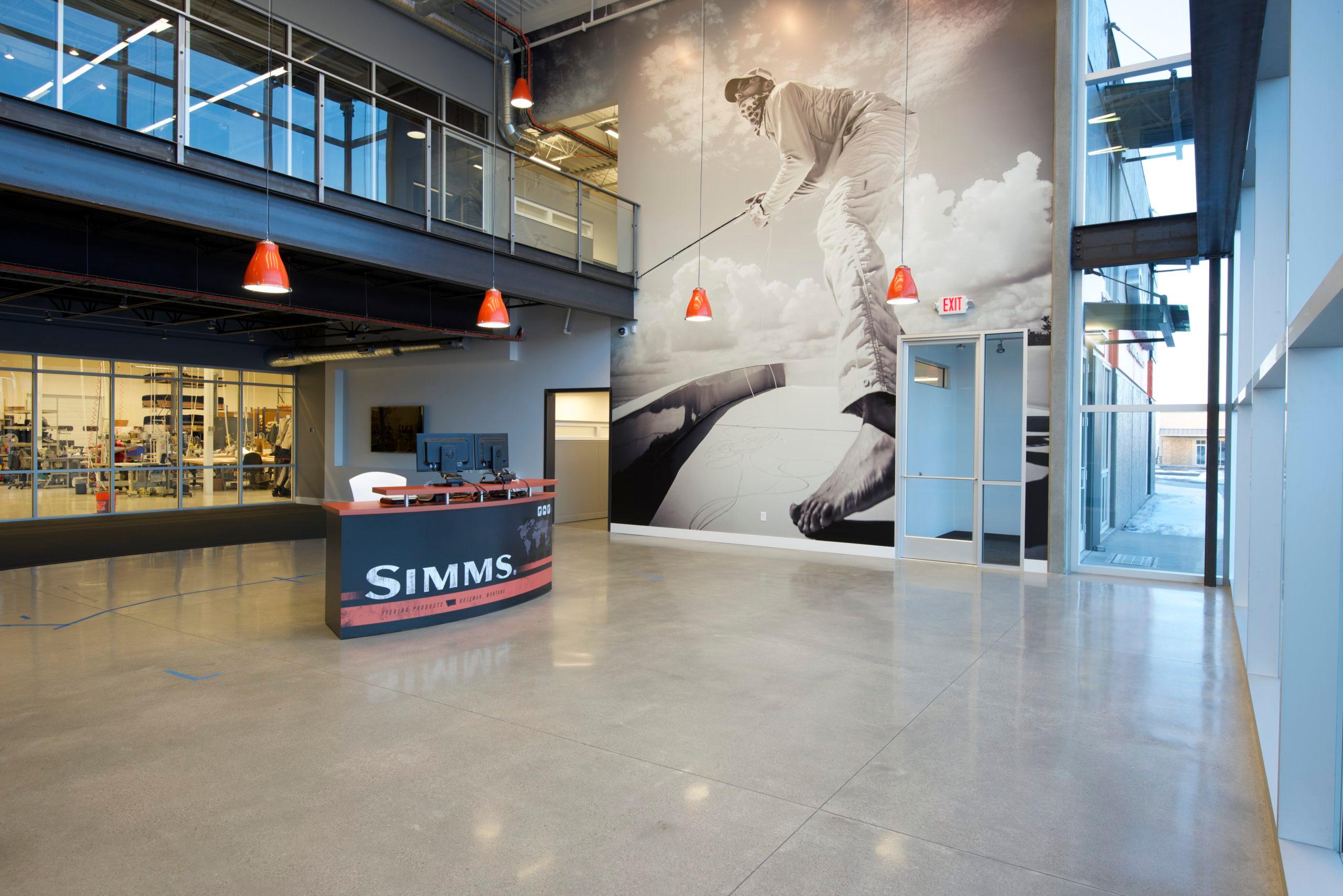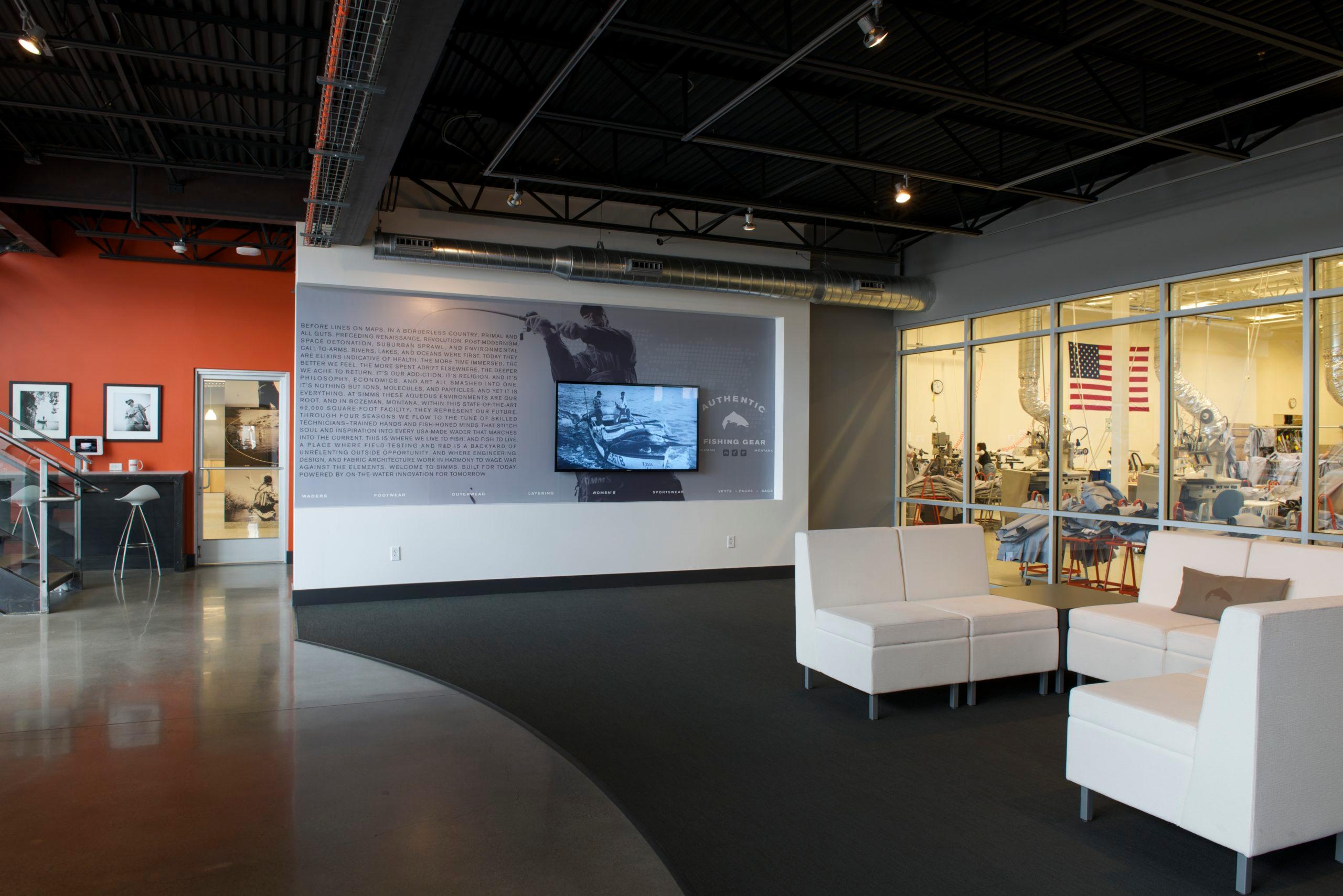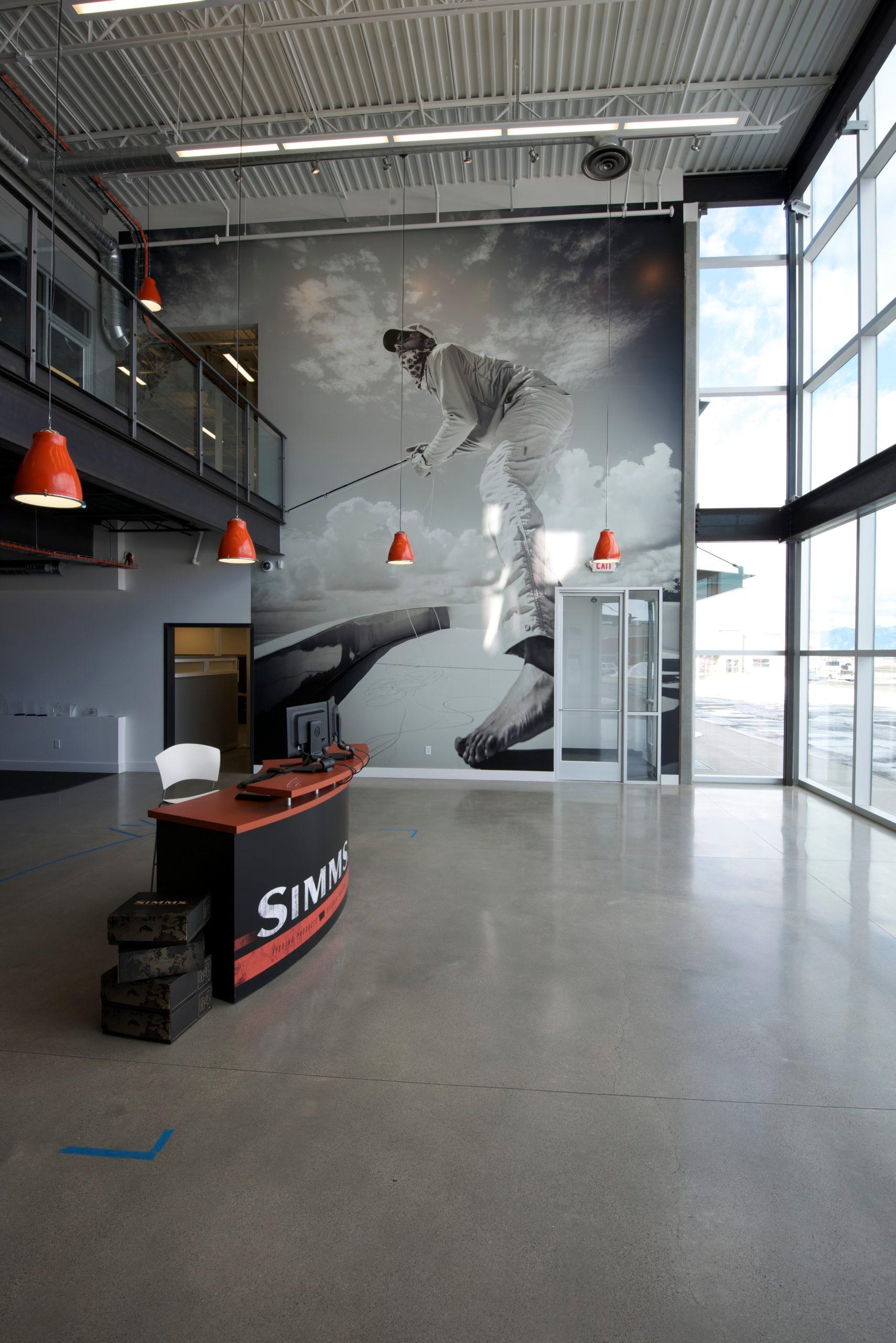 Simms Fishing Products is a company that develops the world’s premier technical fishing apparel, footwear, and equipment. When the company relocated its headquarters in Bozeman, Montana in 2012, it engaged JLF Architects and Big-D Construction to design and build a facility that would speak to the company’s brand as the “icon” in the fishing industry. Simms encourages its customer base to visit their headquarters, so incorporating a brand narrative into the design was essential.
