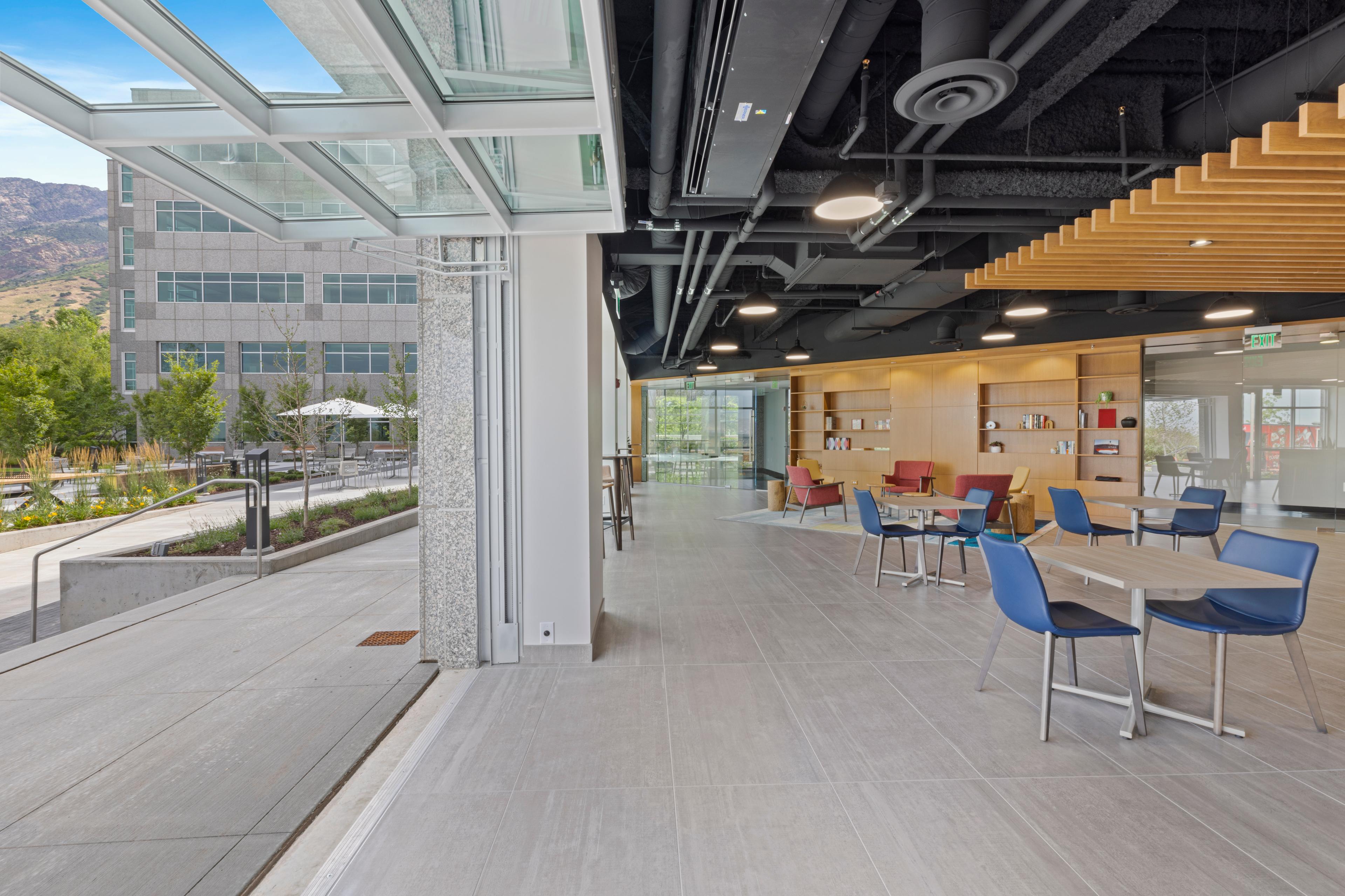 This project was for the construction of multiple tenant amenities at the Cottonwood Corporate Center office complex. The work took place in buildings 9 and 10 of the Center and included interior and exterior improvements. In Building 9, interior renovations were completed to create a new coffee bar and lounge area and a game lounge. A new dedicated Conference Center was built in Building 10 that features a folding door that enables the room to be subdivided into two varying size smaller conference rooms, improving functionality for tenant companies. The exterior scope of work was for the addition of a sizeable outdoor recreation space that features seating areas with firepits, additional outdoor tables and seating, ping pong tables, and the first pickleball court built at an office complex in the state of Utah.
