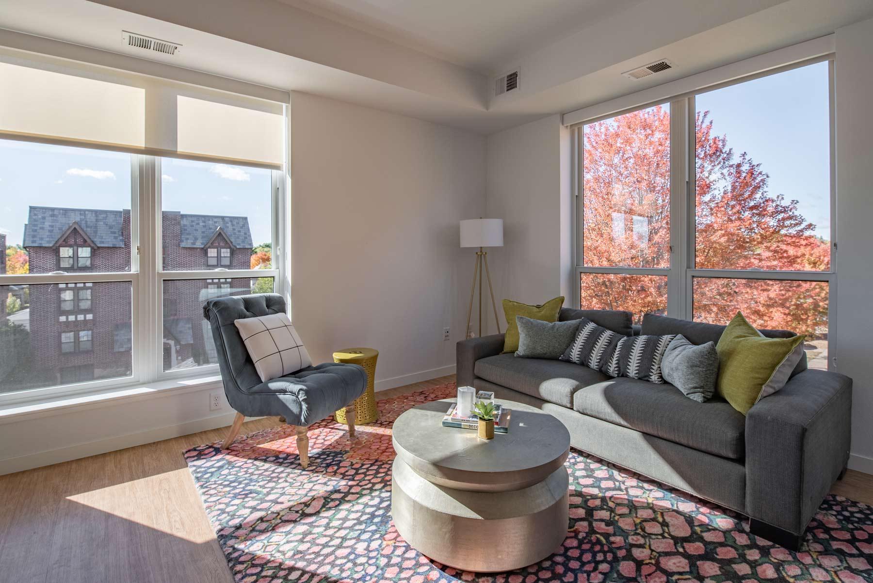 The apartment building features luxury finishes, community rooftop spaces, heated parking, and outdoor decks. The apartment home options include one and two-bedroom apartments, one-bedroom townhomes, and one-bedroom plus den options.