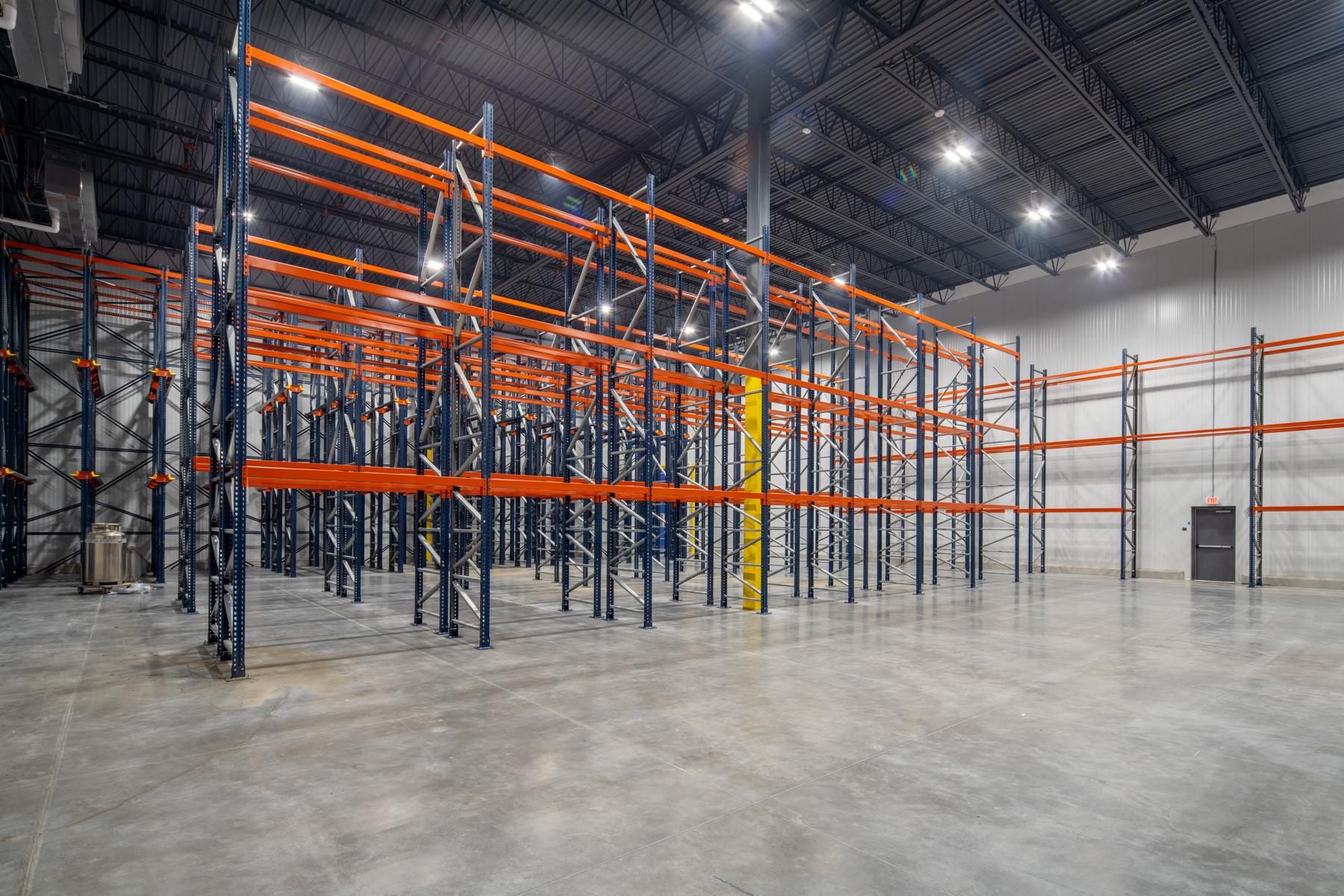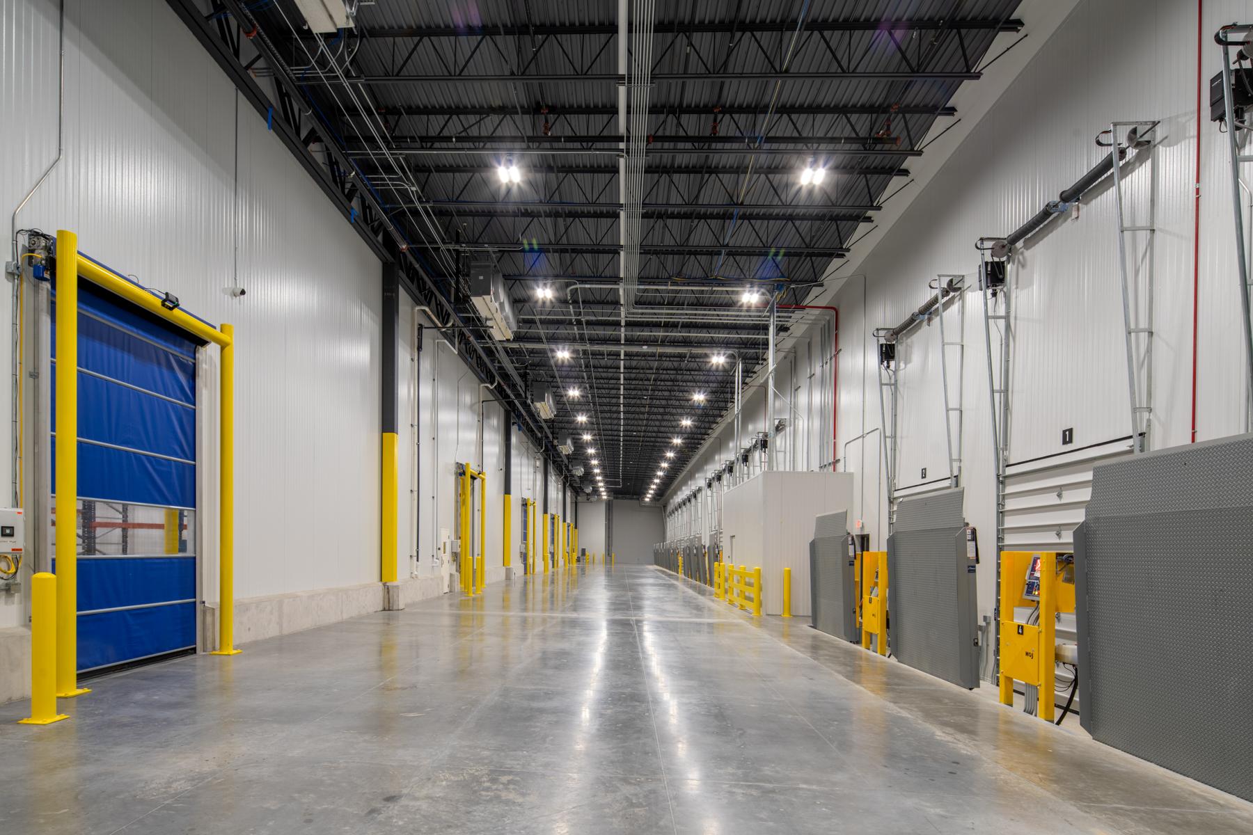 This warehouse and distribution facility features tilt-up concrete construction with a multi-colored painted exterior accented by metal panels. The building includes 22 dock doors, a two-story 7,200-square-foot office, dry goods storage, and an 11,500-square-foot shell space reserved for future tenant buildout. Sophisticated temperature-controlled environments were central to the project, with 35,100 square feet of conditioned space including a 16,000-square-foot cold dock maintained at 40 degrees. Three distinct temperature zones ranging from 36 to 50 degrees accommodate varying produce storage and ripening requirements. Big-D self-performed all concrete work, including site and structural components. The scope also encompassed complete site development with utilities, paving, and landscaping.