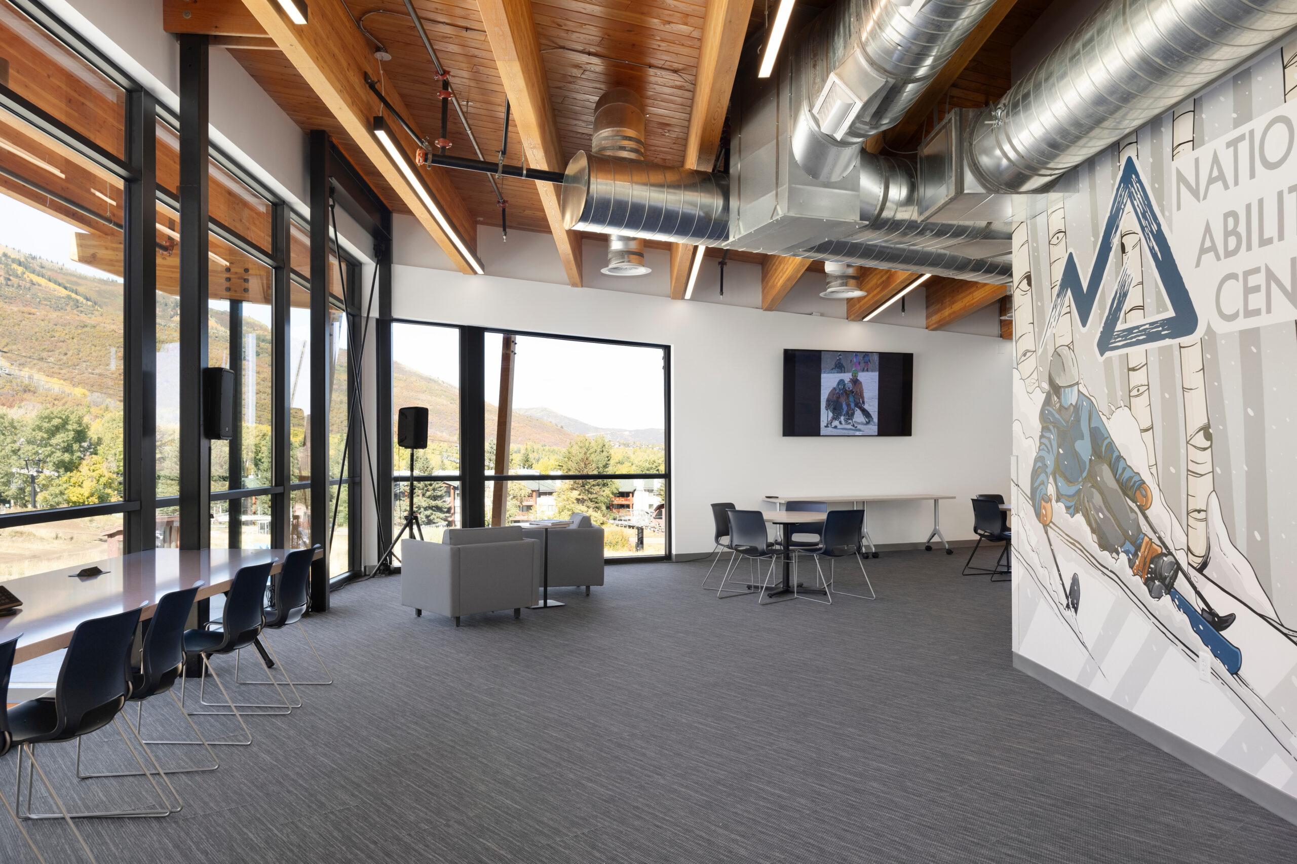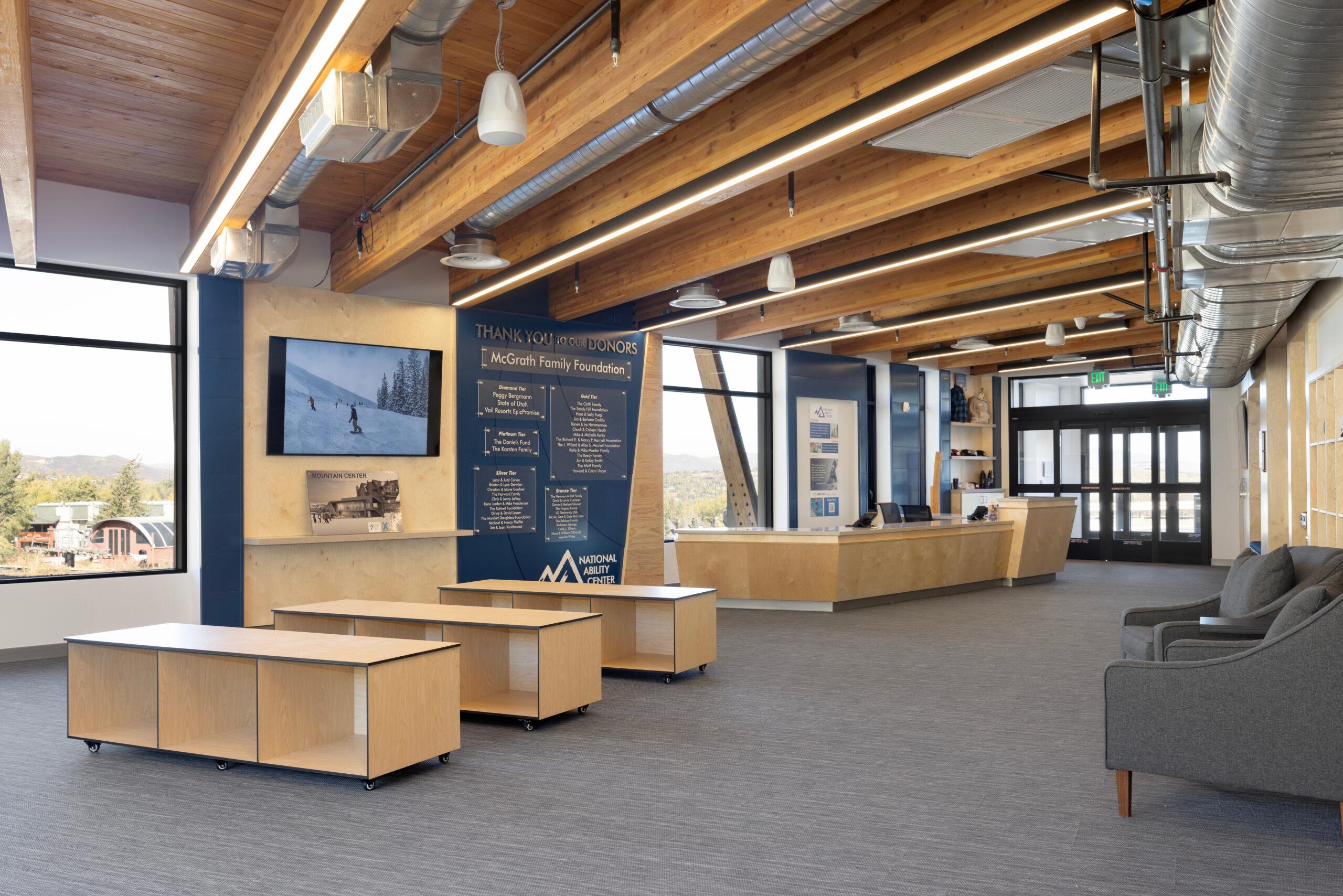 The completion of the McGrath Family Mountain Center at Park City Mountain Resort replaced the existing outdated and cramped double-wide trailer at the base of the Park City Mountain Resort. This new building allows the NAC to expand the ski and snowboard programs that they currently offer to participants and provide space for more than 60 employees and volunteers. This innovative building now accommodates skiers and boarders of various ability levels – allowing participants to exit the building and easily transition to the snow surface of the largest ski resort in the United States. The new 9,400 SF facility includes lobby space, equipment fitting and rental space, expandable training rooms, dining space for participants, offices, meeting rooms, locker facilities, and plenty of wheelchair storage space.