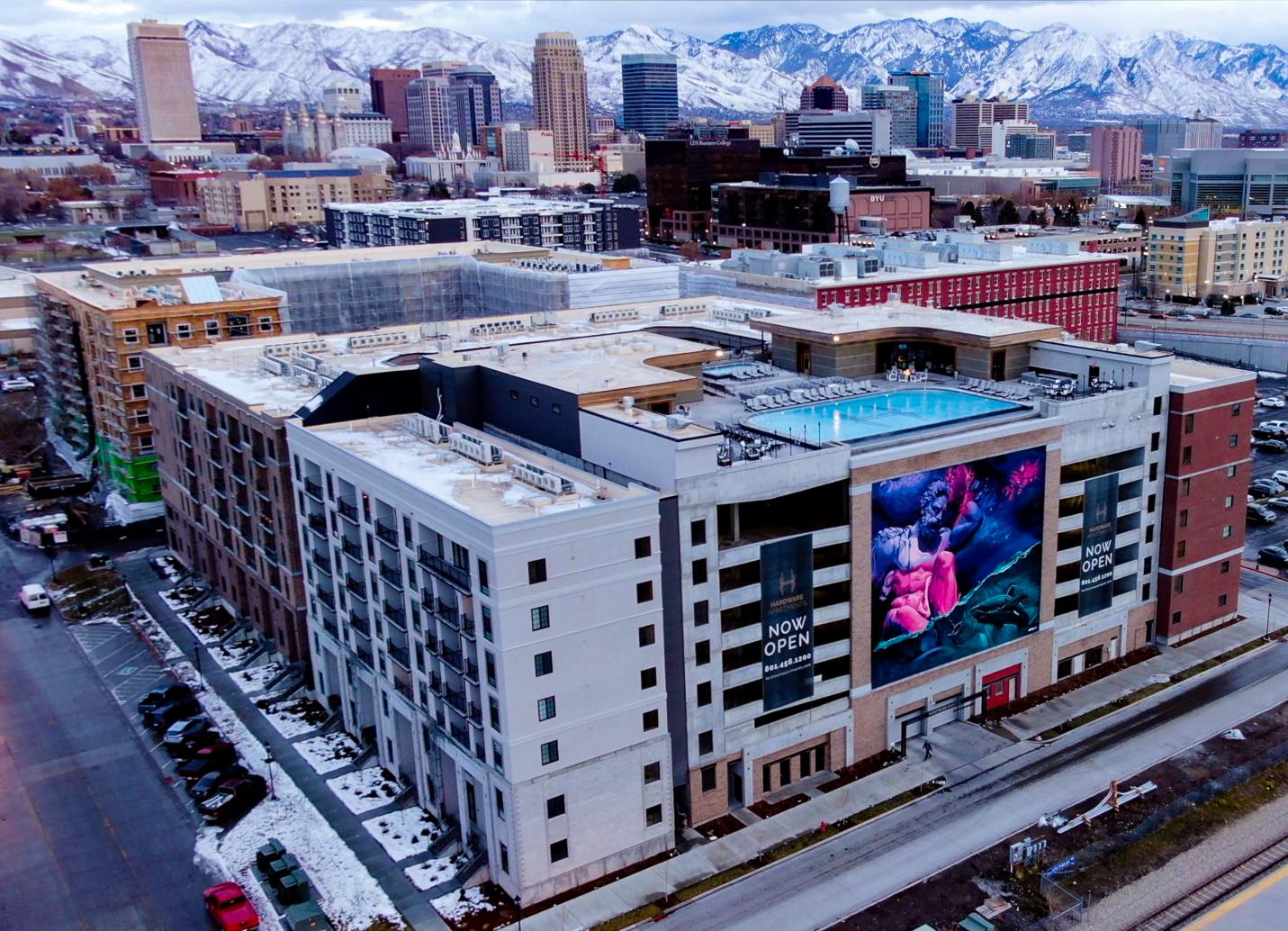 Hardware Village Apartments were completed under two separate contracts in a joint venture with Kier Construction. The project is a new, luxury multi-family and mixed-use community in downtown Salt Lake City that includes two six-story multi-family buildings and a seven-story parking structure with commercial and office space. Hardware Village residences range from apartments to townhomes and condominiums. The west building was completed first and includes 265 units, followed by the east building which includes another 186 units. The Hardware Village community included construction of numerous resident amenities like a rooftop clubhouse and infinity pool, a library with lounge/bar, state-of-the-art fitness center, yoga room, billiards room with oversized video wall, multiple conference rooms, parlor room, and a courtyard with tiered fountains. Materials, finishes and furnishings are all exceptionally high-end with elements like designer fixtures, polished concrete floors, over height solid core doors, quartz countertops, and Anderson windows.