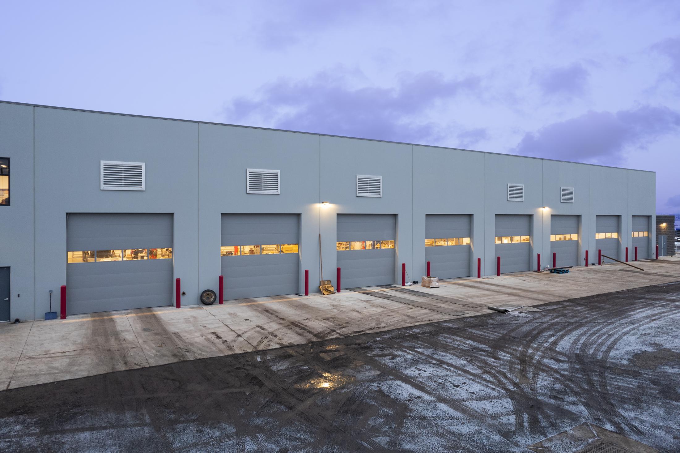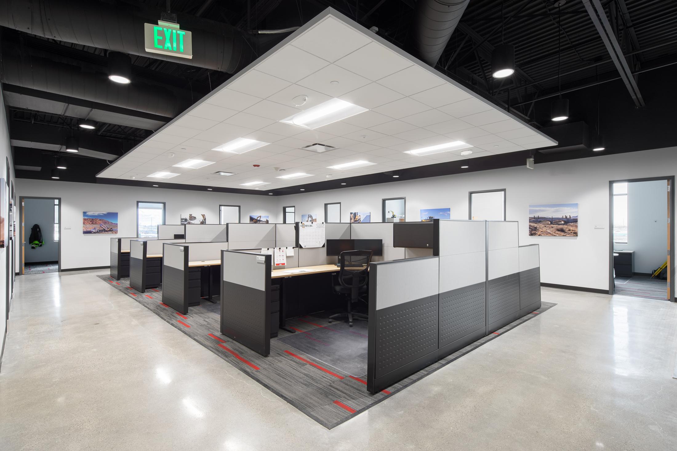 This multi-function facility houses offices for both Sunroc and Sunpro along with a large eight-bay shop. The two-story office building features a central lobby, private offices, open office space, large and small conference rooms, copy-work stations, a training room, employee break room, and support spaces. The transition area between offices and shop is also two-story, including a fitness center, extensive storage, a shop office, and dedicated shop employee break room. The approximately 23,000-square-foot shop area includes a welding shop, oil and lube bay, paint booth, and truck wash bay. Multiple pull-through bays are served by compressed air and oil and lube systems.